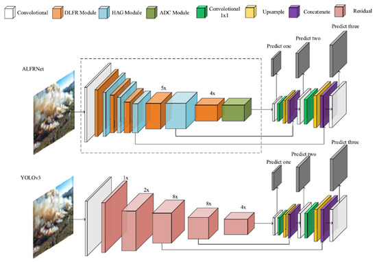 Based on the YOLOv3 architecture, Li et al. [29] proposed a novel architecture (ALFRNet), presented in Figure 5 (details on the implementation of the blocks DLFR, HAG and ADC are given in [29]).