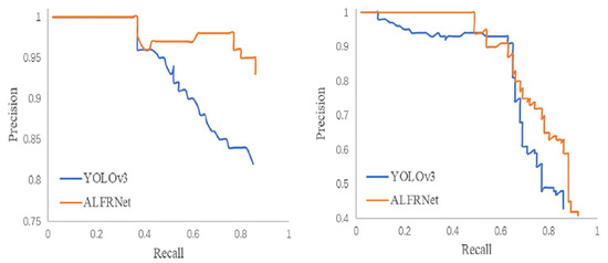 The performance of the ALFRNet architecture was assessed by means of the P-R curve considering two values of the IOU (Intersection Over Union) parameter, as shown in Figure 6.