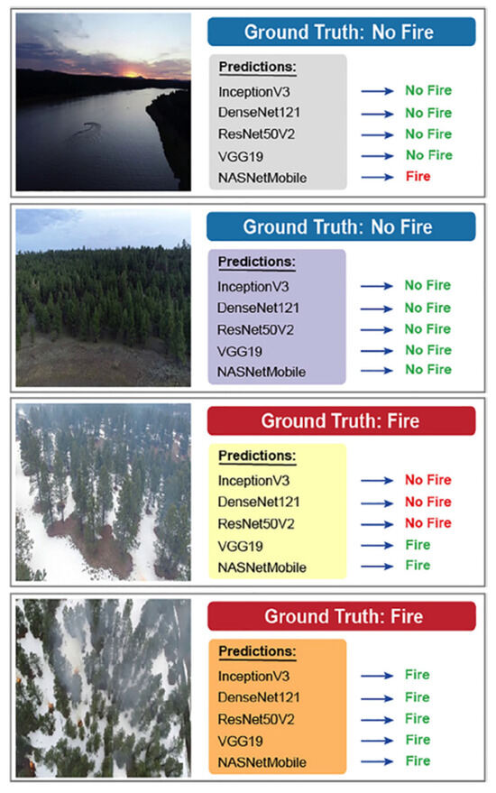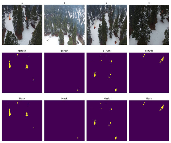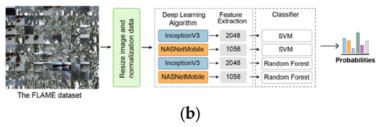 Shamsoshoara et al. [31] produced a two-class (“fire” and “no fire”) labeled dataset containing aerial video recordings and heatmaps of fires, collected by drones during a prescribed burning piled detritus in a pine forest (located in Northern Arizona). Two machine learning problems were discussed in [31]: (1) the binary classification of video frames and (2) developing segmentation methods to determine the flame borders. The binary classification model was based on the Xception network (proposed by Chollet [32]). Xception was developed by replacing the standard Inception modules with depth-wise separable convolutions. The training set consisted of 25,018 frames of type “fire” and 14,357 frames of type “non-fire”. Data augmentation methods such as flipping and random rotation were used to generate new frames and address the issue of bias for unbalanced classes. A test 8617-frame dataset consisting of frames including 5137 fire-labeled frames and 3480 non-fire frames was used to assess the loss and accuracy, as presented in Table 3:
