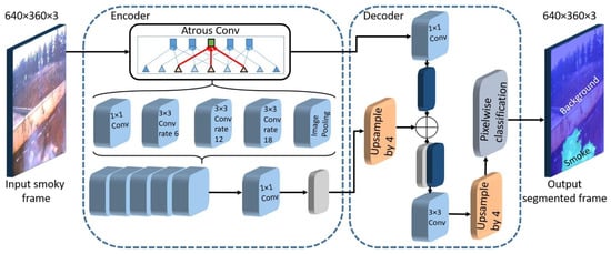 The architecture of the smoke segmentation model presented in [61]. Reproduced/adapted with permission from Ref. [61]. ©2021, Elsevier.