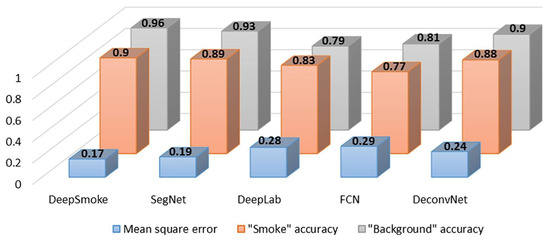 The performance of the proposed framework (DeepSmoke) was compared to SegNet (Badrinarayanan et al. [63]), DeepLab (Chen et al. [64]), FCN (Long et al. [65]), and DeconvNet (Noh et al. [66]), as shown in Figure 10.