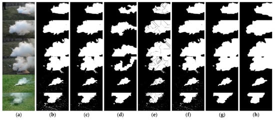 Smoke segmentation results: (a) original image; (b) Fuzzy C-Means; (c) K-means; (d) Density Peak Clustering; (e) Watershed; (f) Mean Iteration Threshold; (g) TDSPC; and (h) Manually labeled images. Reproduced/adapted under the terms and conditions of the CC BY license from Ref. [67]. ©2022, MDPI.