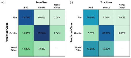 Especially during the early stages of the fire, smoke is almost translucent and it has a low contrast, diffuse boundaries and a rapidly changing shape. Standard smoke detection methods employ image processing approaches to extract smoke features, Gong et al. [49]. Other approaches include frameworks for high-definition video streams using fused spatial and frequency domain features, Liu et al. [50], wavelet analysis, Gubbi et al. [51] and statistical properties, Yuan et al. [52]. Deep learning-based algorithms treat the smoke detection task as either an image classification problem (Muhammad et al. [53]) or a video classification problem (Lin et al. [54]). A less conventional approach was reported by Lin et al. [54], where smoke detection was achieved through a 3D convolutional network, extracting both spatial and temporal features. In general, these deep learning models are trained on smoke datasets collected in controlled environments. The problem occurs when weather conditions (fog, rainfall, nebulosity, etc.) considerably modify the conditions under which the algorithm was trained. A standard approach to deal with these occurrences is dehazing the images, Berman et al. [55]. More advanced methods include synthesizing fog on images or developing smoke datasets in foggy environments, Gong et al. [56]. Sathishkumar et al. [57] employed transfer learning models VGG16, InceptionV3 and Xception and a heterogenous dataset collected from several sources to develop models with the purpose of detecting fire and smoke in still images. A four-classe dataset, as presented in detail in Table 6, was used.
