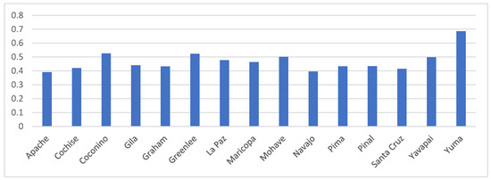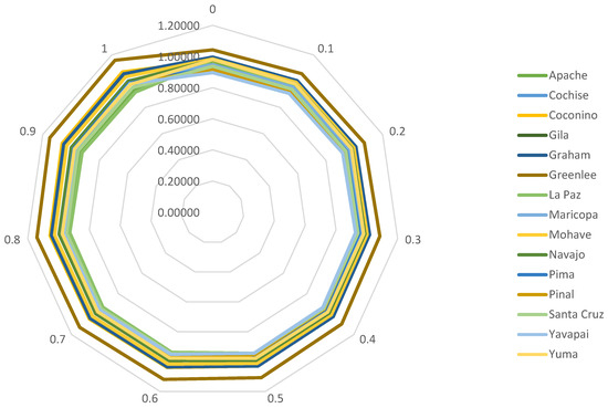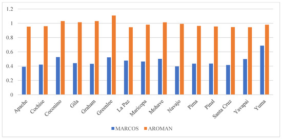 As can be noticed, the MARCOS method ranks Yuma as the highest, followed by Coconino, Greenlee, etc. The comparison results of both methods are presented in Figure 6.