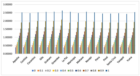 In the second sensitivity analysis, we revealed that the ranking order remains stable, except when λ = 0, where Coconino holds the first position, and Greenlee is the second best. In conclusion, both sensitivity analyses indicate a high stability level of the AROMAN method.