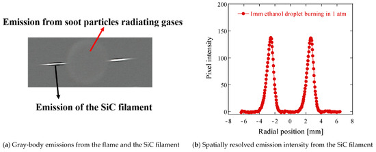 Thin filament pyrometry (TFP), a method that has been extensively studied in previous studies on laminar diffusion flames [24,25], was used to determine the temperature of the droplet flame. The TFP technique involves measuring the radiation intensity from the SiC filament (the same filament used to tether the droplet) and determining the temperature of the measured gray-body emission from the SiC filament using the Planck equation. The emission from the SiC filament at 700 nm imaged using the high-resolution CCD camera is shown in Figure 3a. Flame radii were determined by measuring the spatial extent of the maximum luminosity region of the SiC filament (see Figure 3b).