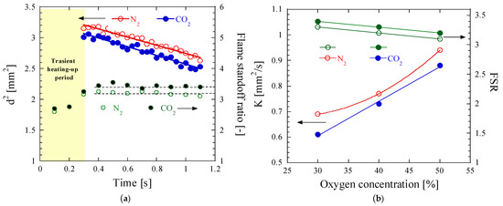 Figure 5 displays the results of the analysis of the droplet and flame histories of the ethanol droplets burning in 40% O2 in the N2 and CO2 environments. In Figure 5a, a linear fit to the evolution of the square of the droplet diameter d2 over time after the transient heat-up period yielded the droplet burning rate K. The flame standoff ratio (FSR) computed by dividing the flame diameter by the instantaneous droplet diameter increased initially and then approached quasi-steady behavior over time. The measured droplet burning rates K and average FSRs (determined from the quasi-steady state) for the experiments in Figure 4 were plotted as a function of O2 concentration, as shown in Figure 5b.
