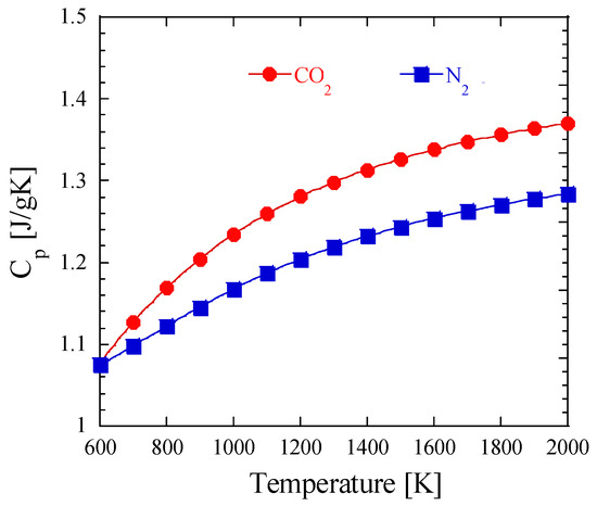 Heat capacity for CO2 and N2 as a function of temperature.