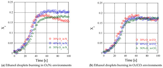 Figure 7a,b shows the calculated radiative heat loss fractions as a function of time when the O2 concentrations in the N2 and the CO2 environments vary from 30% to 50%. As shown in the figures, the radiative heat loss fraction rapidly increases and approaches the quasi-steady values in all of the experiments. The most dramatic change in radiative heat loss fractions with the O2 concentrations happens in the N2 environments. In the CO2 environments, however, the increases in the O2 concentrations have relatively little effect on the radiative heat loss fraction compared to in the N2 environments. Interestingly, the radiative heat loss fraction observed in the N2 environments increases as the O2 concentration increases from 30% to 40% but falls drastically when the O2 concentration reaches 50%. These intriguing phenomena are closely related to sooting behaviors along with the flame temperature variations. Since soot forms through pyrolysis reactions with a high activation energy [22], the sooting behavior in diffusion flames is sensitive to changes in flame temperature. In an effort to quantitatively investigate the sooting behavior of ethanol droplet flames, the measured maximum flame temperatures Tf max and soot-volume fractions fv max were summarized, as shown in Table 1. For each experiment, the fv max and the Tf max were determined from the time-varying distributions of the soot-volume fraction and the flame temperature measurements. The range of the Tf max for the N2 varied from 1780 K to 2217 K, and for the CO2, from 1710 K to 2165 K, as the O2 concentration in the ambient atmosphere increases. The higher Tf max of the ethanol droplet flames in the N2 environments was primarily due to the higher heat capacity of CO2 with respect to N2. Based on the differences in the heat capacity, the presence of CO2 around the flame produced a lower Tf max, which was approximately 50 ~ 100 K lower than that of N2. The measured fv max ranges from 3.5 ppm for the 40% O2 concentration in the N2 environment (the lowest value) to 4.4 ppm for the 30% O2 concentration in the CO2 environment (the highest value). Despite the slightly lower flame temperatures in the CO2 environment compared to the N2 environment, the CO2 environment exhibited similar sooting behavior to that seen in the N2 environment (in terms of fv max measured as a function of O2) due to the longer residence time of fuel vapor (τr), as shown in Table 1. The longer the residence time of the fuel molecules in a high-temperature environment, the greater the potential for sooting enabled through fuel pyrolysis, nucleation, and surface growth [22]. In this study, the residence time of the fuel vapor within the region bounded by means of the droplet surface and the flame front was calculated using the formulation suggested in the authors’ previous works (see Appendix A for more details).