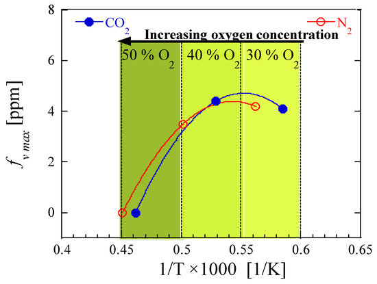 Figure 8 displays the measured fv max plotted with respect to the inverse of Tf max. The measured fv max initially increased, reached a maximum, and then promptly decreased with the increasing O2 concentrations in both the N2 and the CO2 environments, as shown in the figure. These interesting non-monotonic behaviors of fv max with the increased O2 concentrations are linked to the competition between the pyrolysis reactions leading to the soot precursors and the onset of fragmentation of the formed soot precursors influenced by the temperature, as well as the oxidation of the soot precursors and the particles [22]. Because the pyrolysis reactions are rate-controlling at lower temperatures, the fv max increased with temperature. As the temperature increased beyond the threshold value, however, the formed soot precursors fragmented due to the decrease in their thermodynamic stability, thereby reducing the soot yield. As the O2 concentration in the ambient environment is elevated, there is also expected to be greater degrees of leakage of OH radicals across the flame front towards the fuel-rich region which can enhance the oxidation of the soot precursors and the soot particles [22]