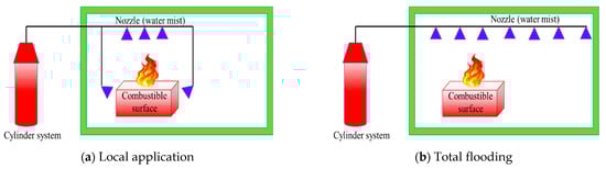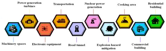 Water mist systems have been proven to perform in many applications, such as enclosed compartments; open air; and large, well-ventilated spaces [25]. In addition, water mist systems are also used as a fire protection method in many applications for industrial facilities, commercial buildings, electrical equipment, residential buildings (including bushfire protection), transportation, tunnels, and explosion hazard mitigation (Figure 7).