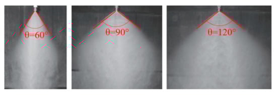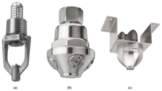 Types of nozzles used to create water mist in water mist systems. (a) Impingement nozzle [21]; (b) Pressure jet nozzle [21]; (c) Twin-fluid water nozzle [21].