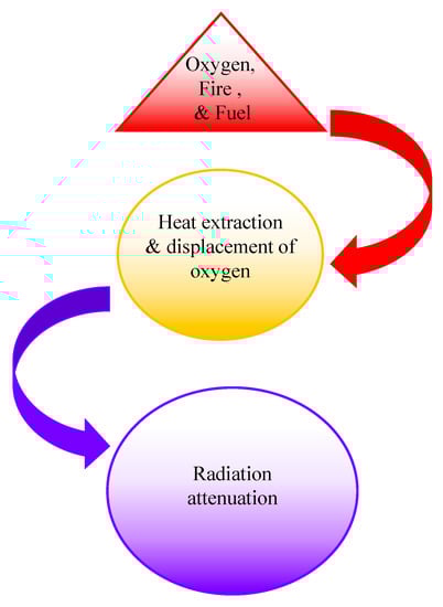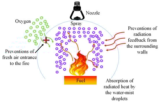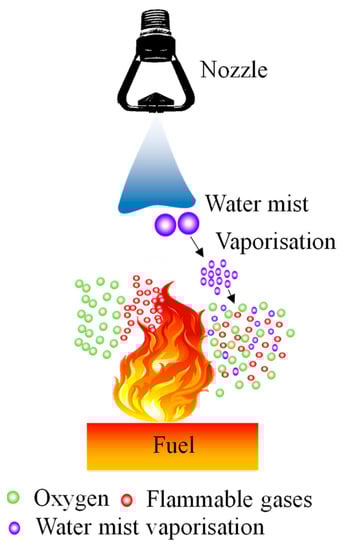 Reducing oxygen from a fire has long been used as a reliable fire suppression method (Figure 4). When a water mist system is discharged locally onto a fire or within a fire compartment, the small water droplets are heated and transformed into steam. When this vaporisation of water occurs within the flame zone, the volumetric expansion can disrupt the entrainment of oxygen into the flame and significantly reduces the oxygen concentration in a compartment [25]. Water mist systems achieve oxygen displacement by producing excessive amounts of steam. The water mist droplets tend to be evaporated before reaching the fire flame, and the evaporated steam causes O2 displacement and contributes to the suppression of the fire [19]. When the water spray penetrates the fire plume, the vaporising water expands to 1600 times its liquid volume [6,26]. This volumetric expansion distributes the entrainment of oxygen into the flame and dilutes the fuel vapour available for combustion. This contributes to the suppression and extinguishment of the flame by diluting the vapour below its fuel–oxygen mixture flammable limit for the given fuel source (removing the chemical reaction required).