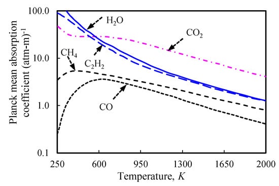 Water mist can prevent fire spread by acting as a thermal barrier to inhibit heating by radiation from the burning fuel to nonburning surfaces surrounding the fire (Figure 5). A substantial amount of heat released from flames is transmitted by radiation during typical fire scenarios. This is a form of energy travelling as electromagnetic waves through a material or space [22]. During a fire, surrounding materials absorb, reflect, or transmit this energy, which increases the temperature and initiates pyrolysis. Kashiwagi [30] described the pyrolysis mechanism of a solid material that causes fuel vapour to be released. The fire spreads as these volatile vapours are ignited by travelling embers or from direct flame contact. Balner [31] described how water droplets prevent the transmission of radiant heat due to the absorption and scattering of thermal radiation. This is known as attenuation (Planck mean absorption coefficient) and is described as the blocking effect [22]. This absorption coefficient of materials has a direct relation to its ability to absorb radiation and heat energy. Figure 6 shows the high absorption coefficient of water (H2O) compared with other gases at various temperatures [25].