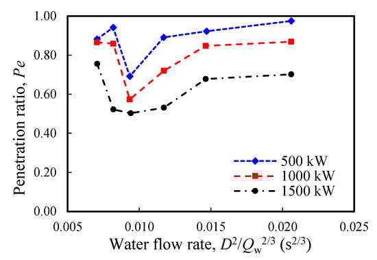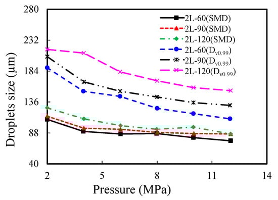 Yinshui et al. [20] and Lui et al. [29] each suggested that an increase in the operating discharge pressure of water mist nozzles contributes to the reduction in the fire extinguishment time. One key reason is that the higher operating pressure of the water mist system results in a stronger penetration into the flame zone. This contributes to the displacement of flammable mixtures in the flaming region for better suppression and reduces the risk of backdraft. The increase in pressure also results in a decrease in the water droplet size, as shown in Figure 10. It is known that a smaller water droplet size is one of the main drivers of water mist suppression performance.
