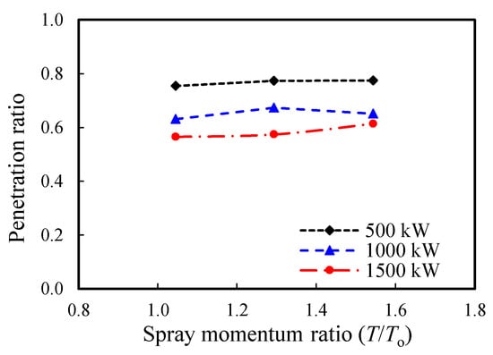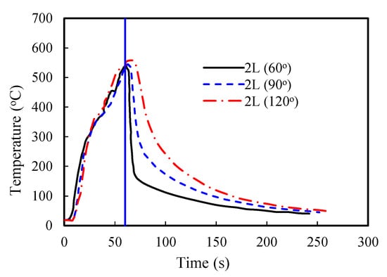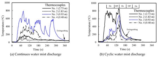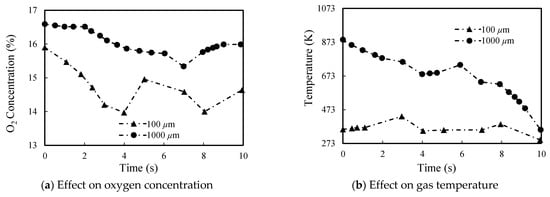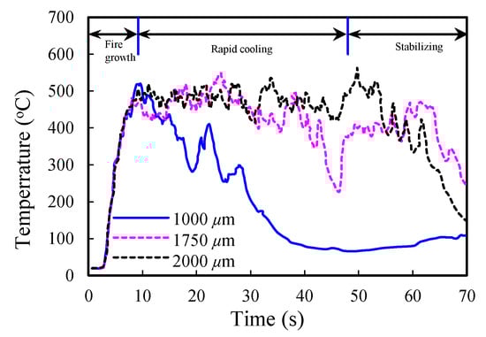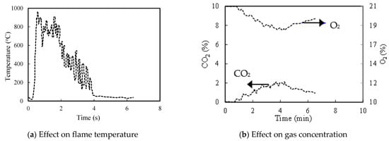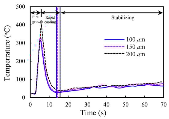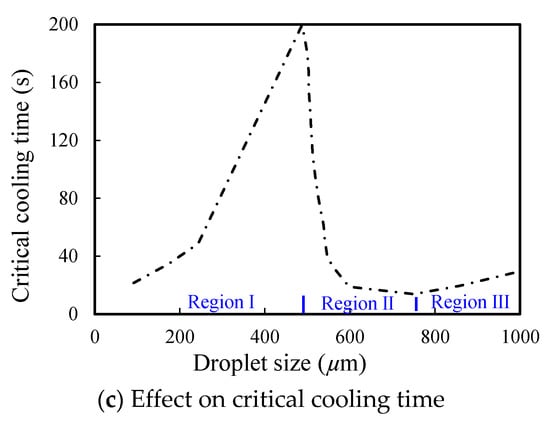 Rapid cooling is the result of a large amount of evaporation generating steam. This steam contributes to the O2 displacement and radiation attenuation, which are water mist suppression mechanisms. Figure 12a highlights the O2 concentration reduction when comparing water droplet diameters of 100 µm and 1000 µm. Ferng [19] observed the critical cooling time for different water mist droplet sizes between 100 µm and 1000 µm and found that performance was better at either end of the scale, as shown in Figure 12c. The effect of droplet size on the temperature reduction and extinguishment time is shown in Figure 12b and Figure 13 to provide examples from different experiments. For a smaller water droplet size closer to 100 µm, the fire is extinguished by rapid evaporation, causing O2 displacement and surrounding gas to cool. On the other end of the scale, closer to 1000 µm in regions II and III, the increased droplet size has greater mass and momentum to directly penetrate the flame region before evaporating. This phenomenon directly cools the burning fire surface and can provide a similar critical cooling time compared with other suppression mechanisms. This finding highlights that it is important for a water mist system to achieve an effective droplet diameter close to 100 µm. The cooling from the flame zone penetration achieved in regions II and III from the momentum can also be achieved for finer droplets if the spray velocity is increased, in other words, the nozzle’s flow rate.