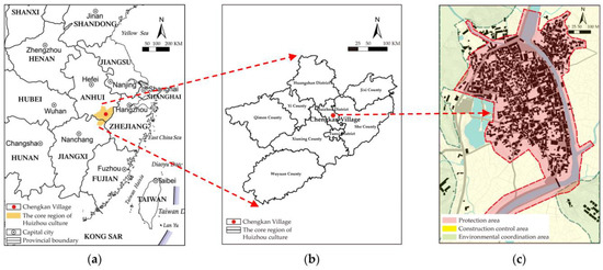Identification of the study area. (a) The Huizhou culture region in Anhui. (b) The Chengkan Village in Huizhou culture region. (c) The Chengkan Village conservation planning.
