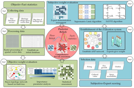 The comprehensive assessment model constructed in this paper takes into account the research results obtained above on cultural relic value, quantitative fire factors, vulnerability assessment and other aspects, focusing on the randomness of heritage-village fires; it combines statistics with expert scoring methods, which is more suitable for the complex nonlinear characteristics of heritage-village fire. The comprehensive assessment model includes three parts: fire risk assessment index, index weight comprehensive algorithm, and comprehensive fire risk assessment. (1) The fire risk assessment index system, based on the fire dynamics index, considers the cultural relic value characteristics and tourism function attributes of heritage villages, but also introduces the assessment index of cultural relic attributes and occupant density. The multiple index system makes the assessment results more comprehensive. (2) The index weight algorithm combines the objective Bayes and subjective ANP-SAVEE mathematical models. The Bayes algorithm is based on the topology analysis network of the fault tree. The Bayes network statistical parameters are obtained by inputting known fire-event data, and the objective weight of the index is further calculated. The weight value depends on the causal relationship between the risk factors and fire occurrence, which prevents the error event caused by the artificial prediction of fire. The ANP-SAVEE algorithm is based on the ANP network, and the subjective weight of the index is calculated by collecting expert scoring data. The SAVEE algorithm standardizes the value of the impact factor, and the weight value depends on the relationship between risk factors. It complements the Bayes algorithm, which focuses on causality analysis, and emphasizes the impact of subjective factors on fire. (3) ArcGIS was used to unify and standardize the cultural relic value sensitivity, village fire hazard, and evacuation accessibility. Then, the three were superimposed to create a more comprehensive fire risk assessment, which can provide guidance for risk assessment in heritage villages.