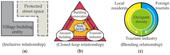 - Evacuation accessibility: Consider fire protection and evacuation from the three loss levels of fire risk in buildings: “building-fire-personnel”. In densely populated areas, passageways are regarded as the basis for active fire prevention measures, such as the use of fire engines and firefighting equipment. The planning time of the traffic network of heritage villages is not based on modern methods of transportation, and fire protection and evacuation capacity are directly related to the traffic grade of roads in the villages. Ensuring smoothness and accessibility will help reduce fire hazards [32]. In addition, since the residential and tourism functions of heritage villages coexist, and the population in the village is mainly composed of local residents and foreign tourists, occupant density can be a basis for decision-making in evacuation planning. It should also be the precondition for evaluating evacuation safety [33]. The local residents’ industry is driven by tourism to a certain extent. There is a crossover between the groups, and the factors present a blending relationship in Figure 4c.