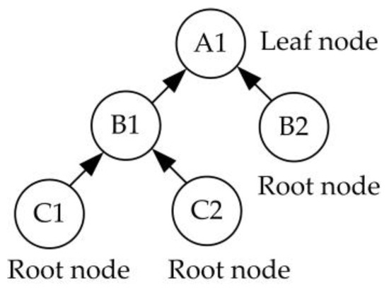 Bayesian network (BN) is the basis of Bayes analysis. It is a directed acyclic graph (DAG) composed of nodes and a conditional probability table (CPT) and is the external manifestation of qualitative analysis. It reveals the logical causal relationship between nodes and can perform forward and backward reasoning. The DAG is composed of nodes and directed edges as shown in Figure 5. The nodes represent fire risk state variables, including root and leaf nodes. Directed edges point from root nodes to leaf nodes. CPT represents the dependency relationship between leaf and root nodes and quantitatively describes the impact intensity between nodes [35].