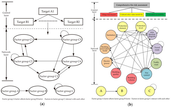 Analytic Network Process (ANP) is an extension of AHP. It is a process of orderly hierarchical analysis for complex problems with multiple influencing factors. It replaces the hierarchical structure of AHP with a network structure and replaces the linear structure with a nonlinear structure. It also adds a feedback mechanism between decision factors to establish a more complex influence relationship. The ANP solves the issue of the factors in a complex system being too independent and not closely related, which does not conform to the objective reality of their interaction within the system. It is suitable for solving the problem of a dependent and feedback decision structure in the fire risk assessment system. As shown in Figure 8a, the ANP system is composed of two parts: First, the upper layer is the control layer, which includes the target and criteria. The target requirement must exist, and the criterion depends on the situation. Second, the lower layer is the network layer, which includes factors and the factor groups they form. The control layer dominates the factor groups. The factors and the factor groups they form interact and depend on each other to form the network hierarchy of the system [37]. We built the ANP network structure chart, as shown in Figure 8b.