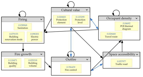 Importance is a method used to define the core factors of the Bayes network. The relationship between fire risk and risk factors in heritage villages is expressed by three importance degrees, which can clarify the importance of each factor on fire risk from different perspectives and provide suggestions for fire prevention measures at different levels [36]. As the fundamental attributes of the protected object, the cultural value attributes (D1, D2) cannot be changed, so the residual importance coefficient gradient is analyzed after exclusion:
