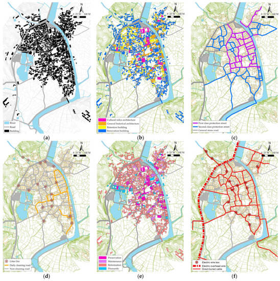 - As shown in Figure 10c, the ancient dwellings of the Ming and Qing Dynasties were most concentrated in the village core and radiated to the surrounding areas and ancestral temples were scattered in the ancient dwellings. At the same time, due to the influence of ancient water transportation, antique stores were generally distributed along the river. In addition to the protection entities of ancient buildings, space elements are also part of the value attributes of heritage villages and cultural relics. Street space is the central space of residential buildings. The core part of the village is mainly made up of first-class protection streets, while the north-south direction is mostly composed of second-class protection streets.