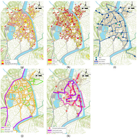 - As shown in Figure 10j, the main road connecting the village with the outside world is the town road, which sees good traffic in the west. The road network in the village comprises main roads and secondary roads which experience poor traffic; additionally, fires can only be extinguished by a village fire brigade using a miniature fire truck. Furthermore, the sites for centralized evacuation, such as yards and squares, are mainly distributed at the edge of the village. There are also only a few centralized evacuation sites in the village.