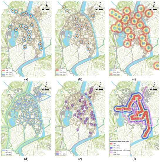 The establishment data of the buffer zone are all fire hazard assessment indices. According to the characteristics of the moving ember and the distribution box (fixed risk source), and in combination with the characteristics of the transmission range of moving ember, three buffer zones (10, 20, 30) are set up (Figure 11a,b) [38]. Three buffer zones (20, 40, 60) are set up for fire hydrants according to the requirements for fire hydrant spacing in the Regulations on the Protection of Famous Historical and Cultural Cities, Towns and Villages (Figure 11c). According to the firefighting distance of micro fire engines, three buffer zones (5, 12, 18) are set up for the roads in the village (Figure 11d) [39]. According to the behavior characteristics of the tourists from other villages and the survey results of the tourist’s behavior, three buffer zones (15, 30, 45) are set up for the travel main route (Figure 11f), as well as two buffer zones (10, 20) for tourist attractions (Figure 11e) and a travel branch route (Figure 11f) [40].