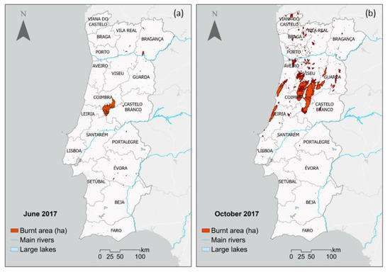 Mainland Portuguese administrative regions (districts) superimposed with the total burned area (a) for June (54,953 ha) and (b) October 2017 (313,794 ha) (Note that only the major wildfires were considered; and, the burned area polygons were attained from ICNF, the Portuguese rural fire database ([43,53,54,55], accessed on 31 November 2021)).