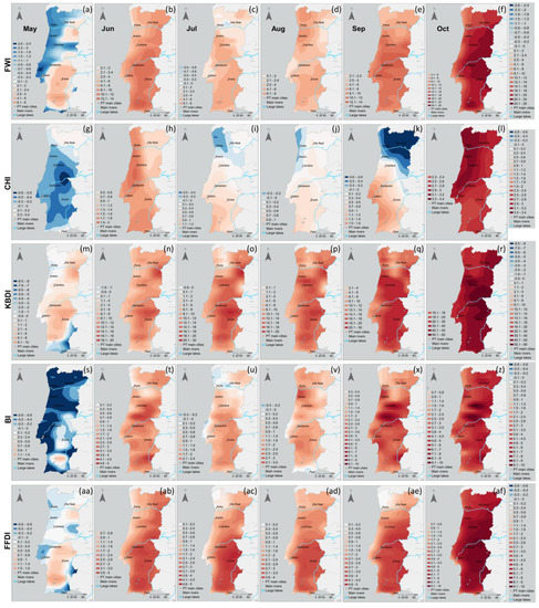 Spatial distribution of the statistically significant (at a 5% significance level) monthly mean anomalies for FWI, CHI, KBDI, BI, and FFDI between 2001–2021 (reference period), respectively by row and 2017 for (a,g,m,s,aa) May, (b,h,n,t,ab) June, (c,i,o,u,ac) July, (d,j,p,v,ad) August, (e,k,q,x,ae) September, and (f,l,r,z,af) October (Note that the MWW test was performed point-by-point at a 5% significance level).
