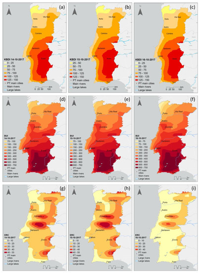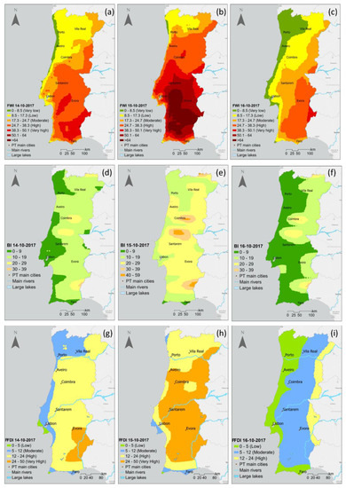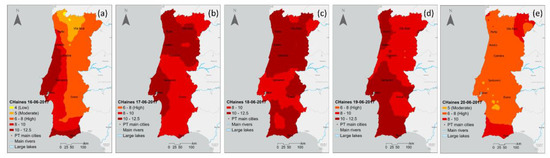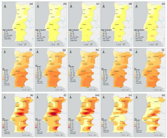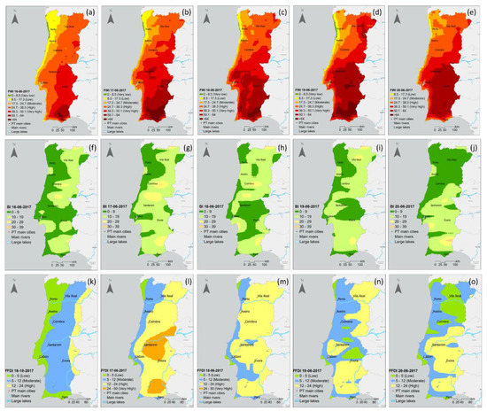 The increase in the danger for all indices from 16 June to 17 June is highlighted. Results revealed that the BI index reached values above 30 on 17 June, the highest value registered in the country on that day, in a region eastward of Coimbra and the Leiria district (Figure 2a and Figure 4f–j).
