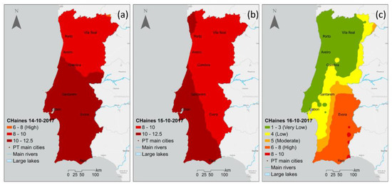 The wildfire season of 2017 was considered a complex of extreme wildfire events (CEWEs), with an unprecedented number of episodes that burned 6% of the mainland Portugal area [17,45] (Figure A1). Within this exceptional wildfire season, two complexes of events were the most tragic, one in June and another in October, not only due to the total burned area but because, in two days, more than 100 human casualties were registered. Owing to the impacts of the 2017 forest fires, since 2018, in Portugal, the CHI has also been operationally used by IPMA [28,29,30,46]. This index, which is going to be further explored in subsequent sections, reflects the conditions of instability and dryness in the lower atmosphere and can be associated with explosive and fast-spreading fires. Specifically, this index denotes the conditions in the lower atmosphere that are favorable to the propagation of forest fires. However, it still needs to be further evaluated in terms of its potential as a tool to evaluate the danger of the occurrence of forest fires in Portugal.