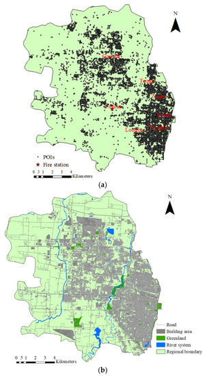 It is not necessary to assume all the land in Zhongyuan District has been fully developed and utilized. For example, there are no buildings in the southwest region. Therefore, it is not reasonable to analyze whether the fire station meets the requirements only according to the theoretical protection scope. Building fires are the most important type of urban fire. The POI data serves as a vector simplification point for various building sites. Therefore, the coverage of fire stations can be analyzed from the POI data point of view. The POIs used in this study were downloaded for free from the Baidu map in Shuijingzhu map downloader. The original POIs are divided into 15 categories. In order to conduct analysis, the original POIs need to be sorted. First of all, the POIs that are not related to fire hazards or have little fire risk should be deleted. Then, duplicate POIs in each classification should be deleted, which is an important task. Finally, according to the analysis of historical fire data and building classification, various POIs are reclassified. After reclassification, the original POIs are divided into eight categories [26]. The eight categories include residential places, hotels, restaurants, commerce places, office places, high-fire risk places, important firefighting places, and general firefighting places. The sorted POIs of various places are shown in Table 1. The number of POIs in different places varies greatly. The greatest number of POIs, namely, 7027, is observed in commerce places. The second number is found in office places and is equal to 6226. They are followed by those in restaurants, general firefighting places, and residential places. Comparing with POIs in other places, the number of POIs falling within important firefighting places and high-fire risk places are relatively small. The important firefighting places include government agencies, cultural relics, historic sites, museums, temples, exhibition halls, libraries, sanatoriums, etc. Gas stations, charging stations, warehouses, internet cafes, dance halls, KTVs, railway stations, bus stations, airports, etc. are categorized as high-fire risk places. As shown in Figure 2a, the POIs are mainly concentrated in the southeast of Zhongyuan District. Figure 2b shows the distribution of buildings, roads, green areas, and water systems in Zhongyuan District. It can be seen that the southeast and the north central area of Zhongyuan District are the two most densely built areas.