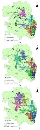 In the analysis, the maximum capacity allocated to each fire station is set to be 3000. It means that the maximum number of POIs allowed to be assigned to a single fire station is 3000. The difference in the POIs assigned to each fire station can be reduced by limiting the maximum number of POIs. The simulation process follows the principle of maximizing the coverage of the POIs when optimizing fire station locations. Figure 3 gives the simulation result of the added fire stations for the remaining six fire stations except Gaoxin fire station. The results reveal a fire station stays at the location of Gaoxin station no matter how many fire stations are added to the target district, indicating the desirable reasonability of the simulation. In addition, the number of POIs assigned to different fire stations varies greatly. Regarding the same station, the distance between it and the assigned POIs presents an obvious difference. Such a difference decreases with the increase in the number of fire stations.