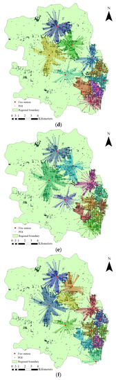 The service areas of the 10 fire stations after optimization are shown in Figure 8b. The POIs and service area covered by each fire station are presented in Table 5. The red area where convex hulls intersect with each other in Figure 8b is the service area in an overlapping state. The overlapped area is about 8.1 km2. After merging the overlapping areas, the total service area of the optimized 10 fire stations is 107.34 km2. It accounts for 55.05% of the total area. Compared with the current situation listed in Table 4, the coverage area of the service area has increased by nearly one time, and the densely built regions in the target area are basically fully covered.
