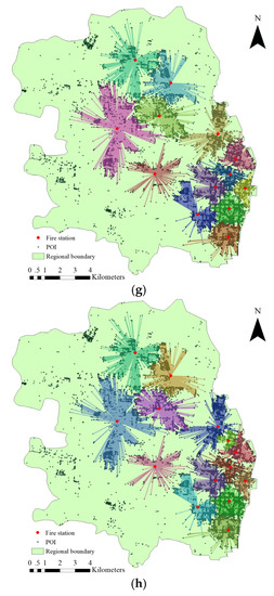 Location and maximum coverage for different numbers of fire stations. (a) Seven fire stations. (b) Eight fire stations. (c) Nine fire stations. (d) Ten fire stations. (e) Eleven fire stations. (f) Twelve fire stations. (g) Thirteen fire stations. (h) Fourteen fire stations. (The lines with different colors in represent the POIs assigned to different fire stations)