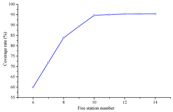 The evolution curve means the change in cumulative coverage rate with the number of fire stations. The evolution curve of the coverage rate of the POIs with the number of fire stations constructed in the target district is shown in Figure 4. With the increase in the number of fire stations, the coverage rate of the POIs presents an overall increasing trend. However, the growing speed of the coverage rate shows a downward trend, which means the sensitivity of the coverage rate to the station number drops quickly. The curve tends to be stable as the number of newly added fire stations reaches four. Therefore, it is reasonable to set up 10 fire stations, namely, 3 new fire stations that are necessary to be constructed in the target district. Based on such optimization, a total of 23,780 POIs are allocated to the fire stations. Figure 5 shows the positions of three additional fire stations when considering Gaoxin Station. At this time, 22,889 POIs are covered. The coverage rate reaches 91.12%. The coverage rate is lower than that of the planned fire station in Figure 3d, indicating that the layout predicted by the simulation is better. However, it is not economical to move Gaoxin Station to the predicted place due to the small difference between Figure 3d and Figure 5.