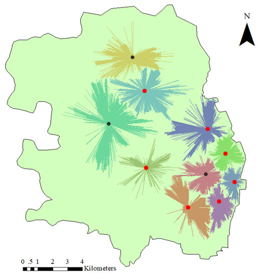 Maximum coverage of fire stations after planning. (The lines with different colors in represent the POIs assigned to different fire stations; The red and black dots represent the existing and newly added stations respectively.)