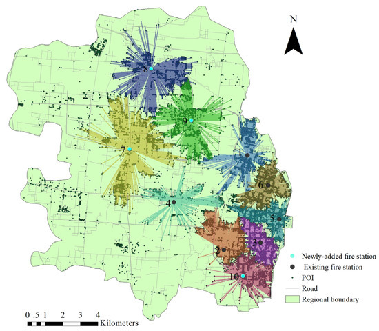 There are 38 and 9 uncovered POIs in high fire risk places and important firefighting places, respectively. The accessibility of the fire stations to the referred POIs is analyzed. The fire stations and route distribution to reach the unallocated points with the shortest time are identified and shown in Figure 9. All the leftover 47 points are matched to the nearest fire station. There are 6 points whose driving time to the nearest fire station is less than 5 min, and 2 points whose driving time is more than 10 min. Compared to the fire stations before optimization, the number of demand points in uncovered high-fire risk places and important firefighting places is obviously reduced. At the same time, more than 95% of the uncovered demand points can reach the nearest fire station within 10 min. That means the proposed optimization method improves the accessibility of the fire stations to a large extent.