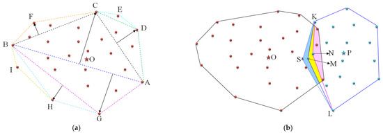 Identification method of the convex service area corresponding to the fire station. (a) Recursive principle. (b) Overlapping coverage area. (The red and blue stars (O and P) represent the different fire stations; The red and blue dots represent POIs within the convex hull covered by fire stations O and P respectively; The letters except O and P represent the POIs selected for analysis.)