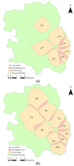 Service areas of fire stations. (a) Existing fire stations. (b) Fire stations after planning.