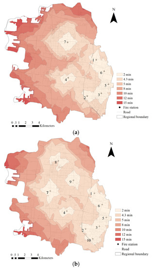 Accessibility refers to the range of areas where fire vehicles arrive at different times from the fire station. The purpose is to analyze the area that can be reached by fire vehicles from the fire station in different time periods before and after the optimization of the fire stations. The accessibility is closely related to the firefighting capabilities of the fire stations. In order to analyze the sensitivity of the accessibility of the fire station to travel time, 2 min, 4.3 min, 5 min, 8 min, 10 min, 12 min, and 15 min are set as the time interruptions for simulation. The accessible ranges of the existing fire stations and the fire stations after optimization are shown in Figure 10a,b, respectively. The area covered by the color, from light to dark, indicates the arrival time of the fire forces as it becomes increasingly longer. The total area of the reachable range of the fire stations corresponding to different arrival times is presented in Table 7. For existing fire stations, the area that can be reached within 2 min accounts for 12.2% of the whole district. The proportion of the area that can be reached within 4.3 min increases to 36.7% of the whole area. Within 5 min and 10 min, the fire stations can reach 45.5% and 85.3% of the target areas, respectively. Within 15 min, the fire vehicles can reach 95.6% of the Zhongyuan District. After optimization, the area that the fire stations can reach within 2 min accounts for 18% of the whole area. The area that can be reached within 4.3 min is 108.8 km2. The fire stations can reach 94.4% of the area within 10 min. Within 15 min, fire vehicles can reach almost every corner of the district. The uncovered area at the region boundary in Figure 10b is mainly affected by the electronic road network used in the simulation calculation. In addition, through the time sensitivity analysis of accessibility, it can be seen that some densely built areas are not effectively covered by fire stations within 4.3 min. According to the sensitivity analysis, the scope and location of the critical areas can be determined, thus providing a basis for constructing local miniature fire stations in the target district.