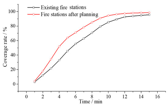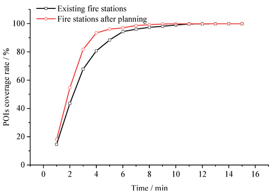 Regarding fire stations before and after the optimization work, the evolution trend in the coverage rate of the accessible area and POIs with the driving time (1~15 min) is shown in Figure 11 and Figure 12, respectively. As shown in Figure 11, the curve shape indicates that the coverage rate of existing fire stations increases steadily within 12 min. Beyond the critical time, namely, 12 min, the evolution curve remains unchanged. After optimization, the coverage rate of fire stations increased rapidly within 10 min and then the curve was stabilized. That means the rising speed of the evolution curve corresponding to the optimized stations is faster than that related to the existing stations. Within the critical time, the difference between the two evolution curves is obvious. The optimized curve remains about 15% higher than the current curve. Beyond the critical time, two evolution curves become stable; the former is about 5% higher than the latter, which reaches 95% and 90%, respectively. Compared with existing fire stations, the accessibility of the optimized 10 fire stations in the target area is better. Therefore, the fire rescue efficiency of the whole district is effectively improved after re-planning work. As shown in Figure 12, the number of POIs covered by current fire stations is smaller than that covered by the optimized ones when the driving time is less than 6 min. Within this time range, the rate difference experiences first increasing and then subsequent decreasing processes, respectively. The largest difference occurs when the driving time is set to 3 min. Beyond this time range, the difference in coverage rate becomes small. However, the arrival time is so long that the best time for firefighting has been missed. Thus, it is necessary to optimize the fire station layout in Zhongyuan District. After optimization, 94% of the POIs can be covered by the fire stations within 4 min. This rate reaches 97% at the time of 6 min if the current fire station layout is remained. That means the firefighting capacity of the fire stations is greatly strengthened after optimization with the method proposed in this study.