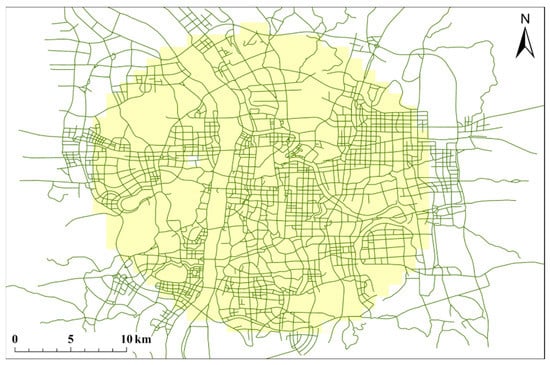 Road network data were obtained from the Open Street Map (OSM) platform (http://www.openstreetmap.org/ (accessed on 15 October 2021)). Two-lane roads and higher-level roads were preserved and preprocessed as a single line. Non-municipal roads, such as the inner roads in residential quarters, were removed.