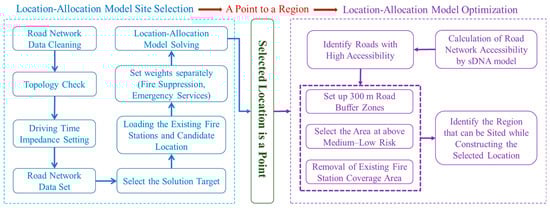 Some studies have used the L-A model to integrate urban fire and technical rescue and other emergency services [20] to site fire stations [21]; however, studies comparing spatial loadings of different emergency services for the purpose of site selection are inadequate. Furthermore, L-A model-based methods provide specific optimal fire station locations, which are often unavailable or are in conflict with planned facilities. Thus, the selected location for a region must be sufficiently large and capable of maintaining the efficiency of the emergency service. A reasonable consideration is to circle a region around the selected site according to road accessibility (i.e., the ease of reaching service facilities or accessing the corresponding services by some means of transport [22,23,24,25]). However, in traditional planning, the location of fire stations is determined using the L-A model, and then, the urban transportation network is used for routing fire trucks to disaster sites based on road accessibility. These road accessibility studies have been extensively applied in transportation network analyses, but they have not been integrated with the L-A model at the planning stage.