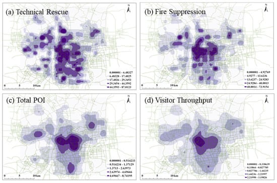 The spatial distribution of technical rescue, fire suppression, POI, and visitor throughput are presented in Figure 3. Fires were concentrated in the center (old town) and the visitor throughput was highly concentrated as well. In contrast, technical rescues were spread extensively, with various secondary clusters scattered outside the old town. Similarly, POIs were also distributed in parts, the primary occurrence in the old town and three smaller occurrences in the east, west, and south, where the new districts are situated. Such a coincidence might reflect the potential connection between rescues and POIs.