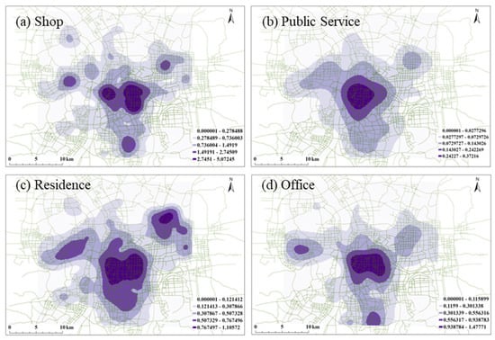 POIs were classified into shops, public services, residences, and offices, and their distributions are shown in Figure 4a–d. The densest part of all groups was in the center (as expected), which is the old town with a high frequency of fires and rescues, and thus, is the core area for emergency concern. Multiple additional subcenters for residences and shops exist in the periphery region that was superimposed on the strong clustering of public services and offices in the center to form the distribution map of total POIs (Figure 3c). The close association of shops with residences was rational, as the former was driven by the market to follow the development of new residential sites because the city was extended outward, while the movements of public services and offices were less efficient. Therefore, the connection between technical rescues and POIs in Figure 3 should be attributed to the residences. This was verified by examining the technical rescue records, wherein the majority of which was composed of removing hornet nests, saving trapped people, and sealing gas leaks.