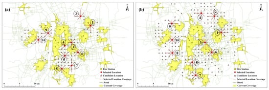 Map of potential fire station locations using (a) fire weighting data and (b) emergency service weighting data.