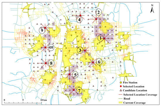 The number of new fire stations in the near future needs to be determined based on financial resources of the government and future municipal planning, rather than locating all possible fire stations. By using the MCLP model in the L-A model [50], the locations of potential new fire stations were computed with a target of 10 new fire stations in the future. This parameter can be adjusted based on the planning of different cities.